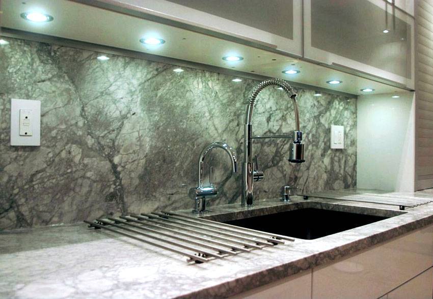 Вмонтировать герметичную ленту в боковую стену возле мойки, рядом с краном. Особенно красиво смотрится освещение фартука на кухне, если он выполнен из матового стекла.