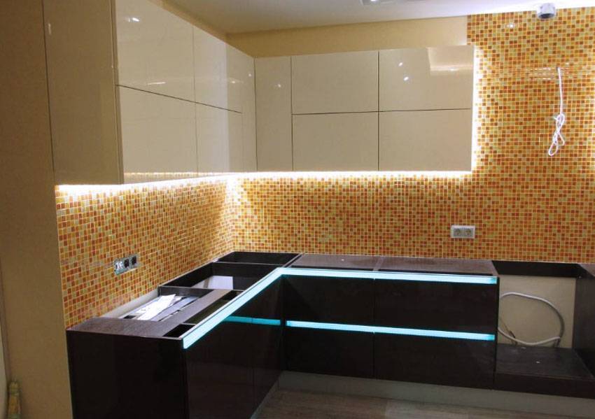 Для освещения столешницы рекомендуется использовать ленту с теплым светом. Следует подбирать модель со степенью защиты не менее IP65, так как на таком участке возможно попадание жидкости. Прикреплять их лучше всего с помощью двухстороннего скотча, но перед применением будет правильным убедиться в его надежности.