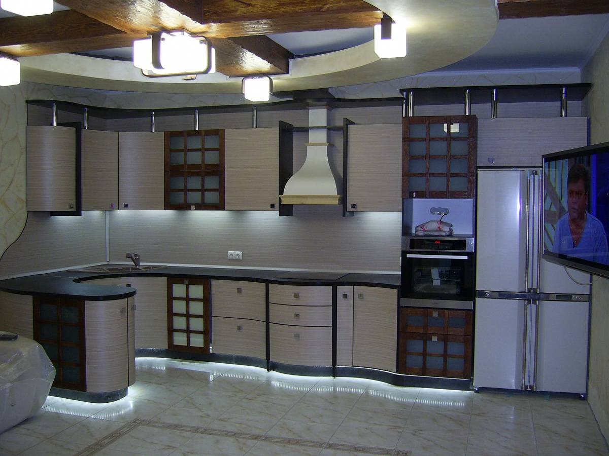 При помощи светодиодных лент можно организовать комбинированное освещение, разделить кухонное пространство на отдельные функциональные зоны. При помощи лед-лент можно эффектно осветить многоуровневую потолочную конструкцию. Можно также разместить ленту в пространстве между кухонными шкафами.