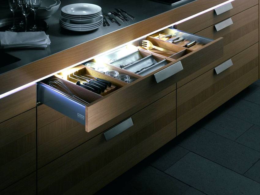 Такие элементы предназначены для внутреннего освещения шкафчиков и ящиков. Смотрятся они очень гармонично, однако их монтаж возможен только после проведения предварительных работ: составления плана и подготовки шкафов.
