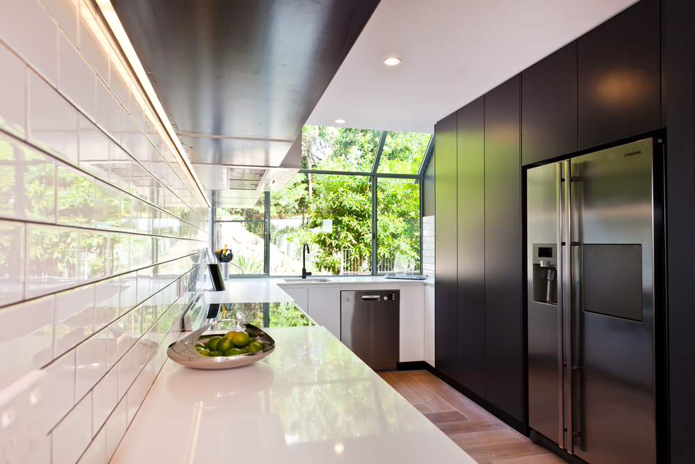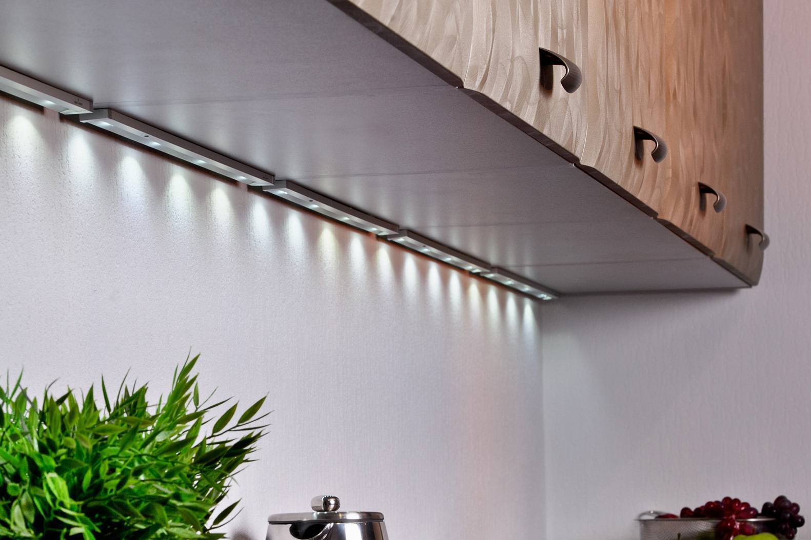 Линейную подсветку обычно располагают на кухне прямо под навесными шкафчиками, размещенными над столом и раковиной. Часто используют для ее обустройства люминесцентные лампы. Их располагают под дном шкафов в одну линию на минимальном интервале друг от друга. К днищу шкафчиков прикрепить их можно обычными шурупами. Монтаж прост и не требует прорезки ниш, как в случае со спотами врезного типа.