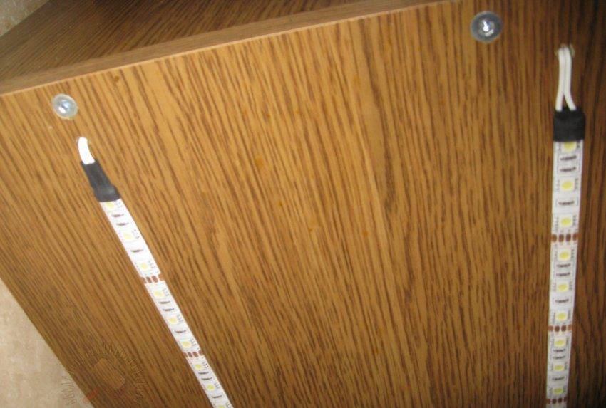 - При наличии клейкого слоя, защитную пленку удаляют, ленту прижимают к выбранному месту. Если такого слоя нет, используют двусторонний скотч. При необходимости, можно отгородить ленту профилем или уголком в цвет шкафа для маскировки (профиль крепят саморезами).