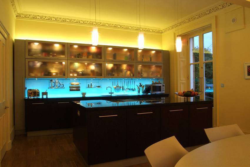 - освещения витражных стекол, кухонного фартука, барной стойки;