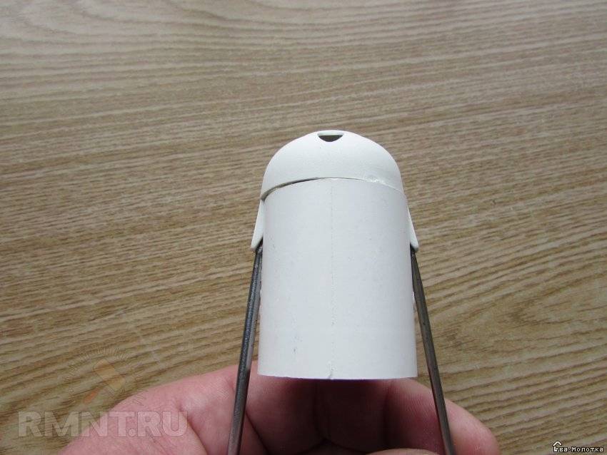 Установите колпачок до щелчка фиксаторов. Полоски изоляции прижмутся частями патрона и будут его придержать, снимая нагрузку с электрических контактов.