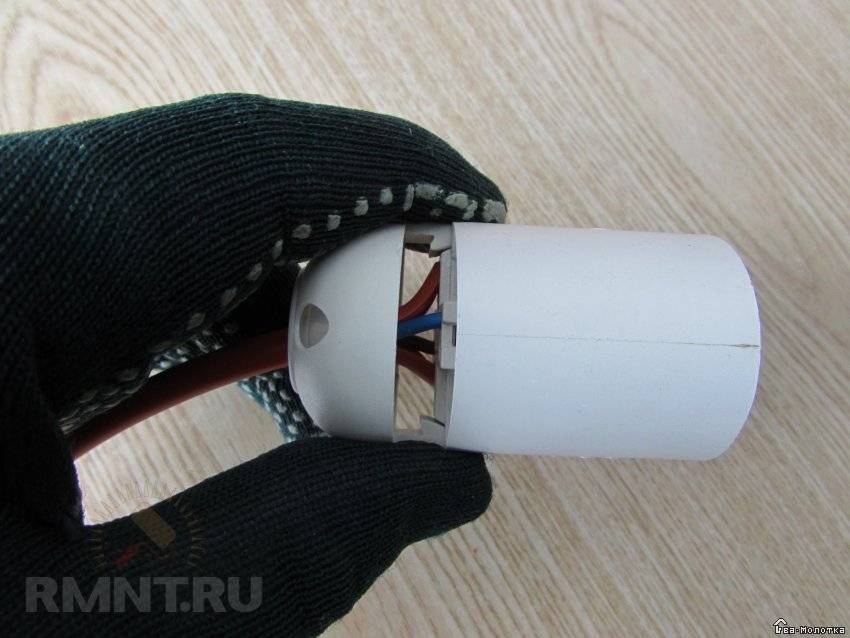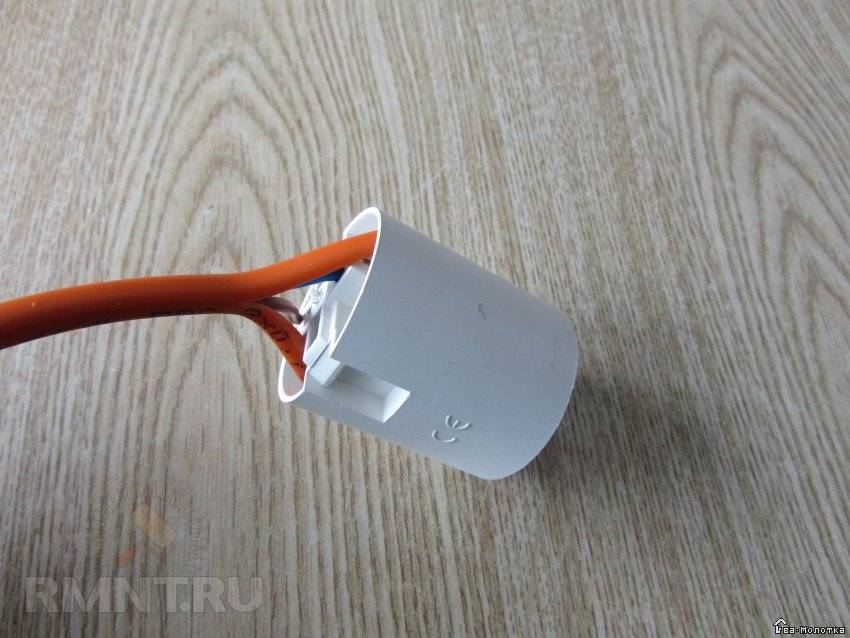 Вставьте провода в пружинные зажимы электропатрона, подключая центральный контакт (фазу) на более темный провод. Заправьте половинки оболочки кабеля внутрь корпуса.