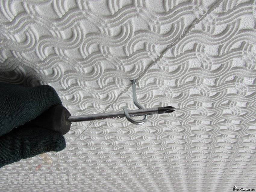 - закрепите крюк на базовом потолке, после чего проверьте его на прочность;