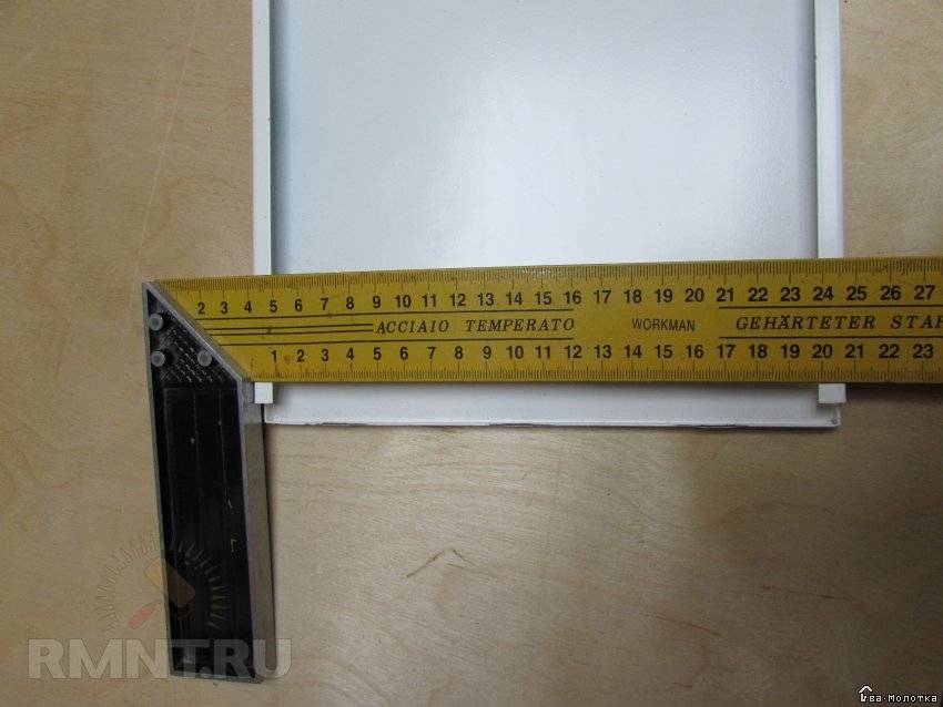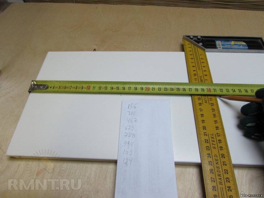 - Нанесите метки карандашом, отмеряя по рулетке расстояние от края, а по угольнику — середину панели.