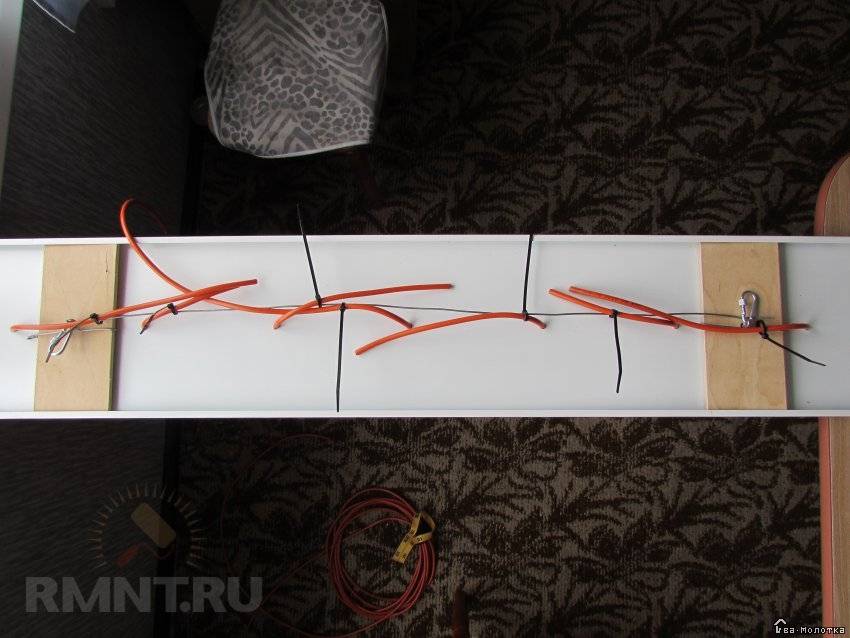 Поочередно закрепляйте кабели в патронах, отрезая длину с учетом высоты подвески и соединения пучками из 3–4 проводников. Размещайте компоненты на местах.