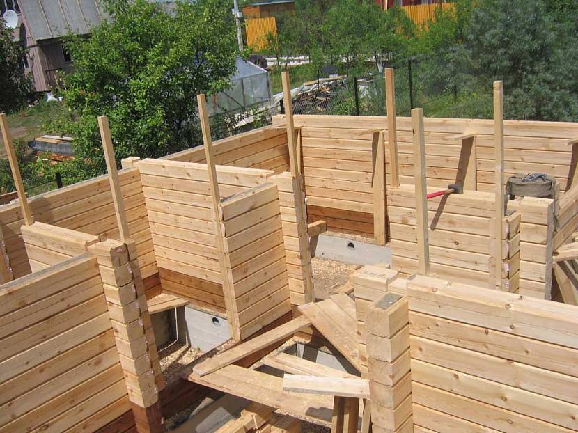 Все работы по сборке конструкции начинаются с разметки и дальнейшего раскроя заготовленного материала. Перед сборкой дерево обрабатывается антисептиком, сушится и только потом в нем сверлят отверстия через каждых 50 см вдоль бруса. С двух сторон укладывается два бруса, сверху еще, в них делаются на концах пазы. Ровняется ряд, и подгоняются углы, выступы подправляются рубанком.