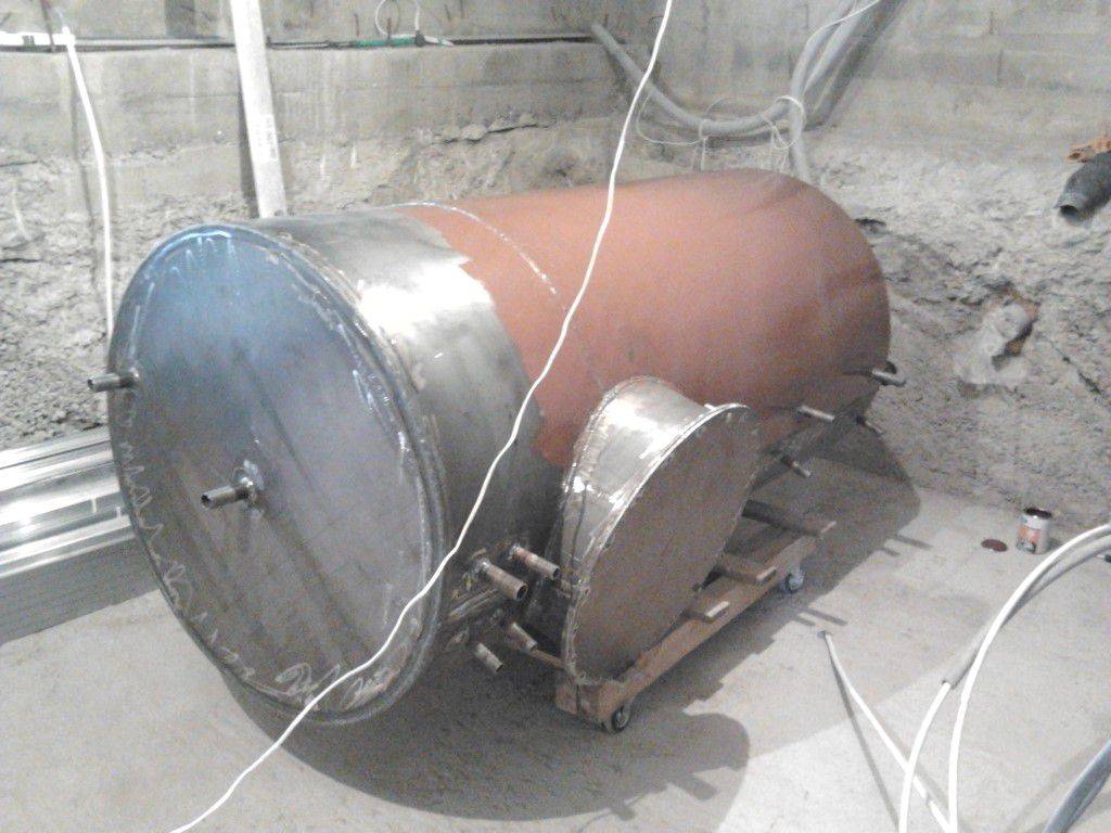 Теплонакопитель можно собрать на основе железной бочки. Объем, как уже отмечалось, подбирается индивидуально, однако в использовании бака вместительностью меньше 150 л особого смысла нет.