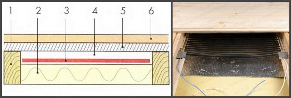Схема устройства инфракрасного теплого пола на деревянном полу по лагам: 1 — лаги, 2 — утеплитель, 3 — ик пленка, 4 — воздушный зазор, 5 — основание пола (ГВЛ, OSB, фанера, пленка полиэтиленовая), 6 — напольное покрытие (ламинат, паркет, линолеум и др.)