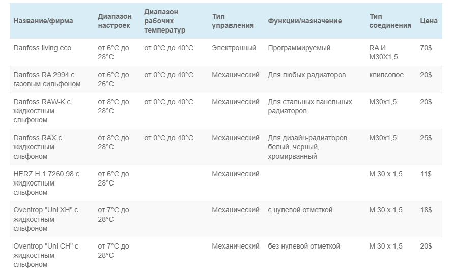 Жидкости чуть медленнее изменяют объемы, но их производить проще. В целом, разница в точности поддержания температуры — порядка 0,5 °С, что заметить практически невозможно. В результате большая часть представленных терморегуляторов для радиаторов отопления оснащена термоголовками с жидкостными сильфонами.