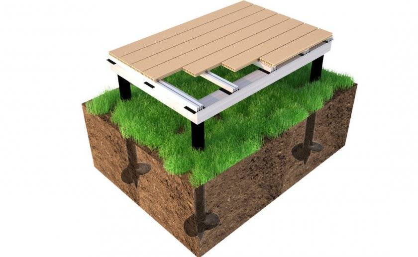 Свайно-винтовое основание отличается экономичностью и простотой монтажа. Несущей способности таких опорных элементов достаточно, чтобы выдержать вес небольшой по площади террасы.