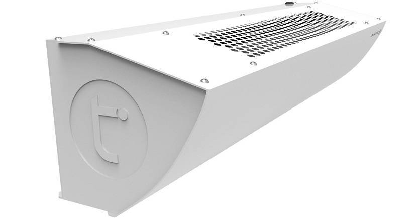 Завеса небольших размеров (81×15,3×16,8 см) рассчитана на крепеж к стене горизонтально. Работает от 380 В. Есть два варианта работы: 4,5 и 9 кВт. Воздухообмен 1200 куб.м/ч. Управляется электронным способом, в т.ч. с пульта. Автоматически выключается, чтобы не допустить перегрева. Цена: 11 000 рублей.