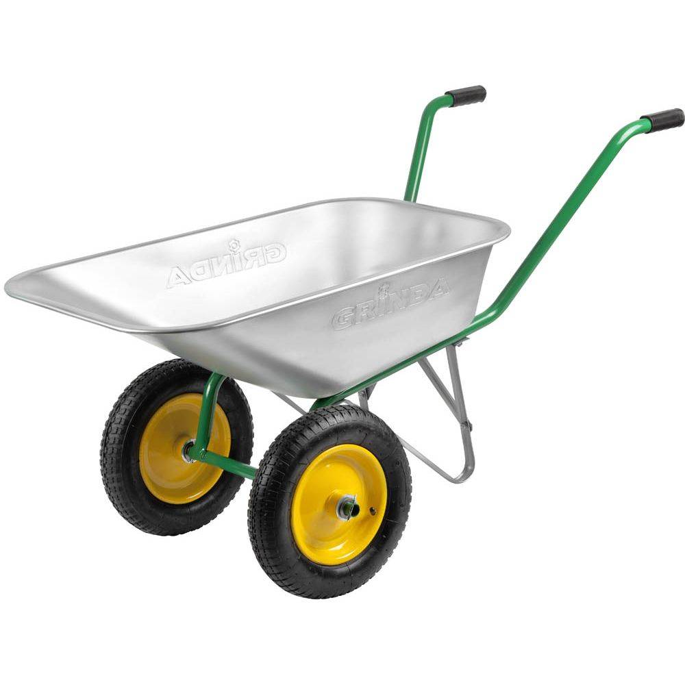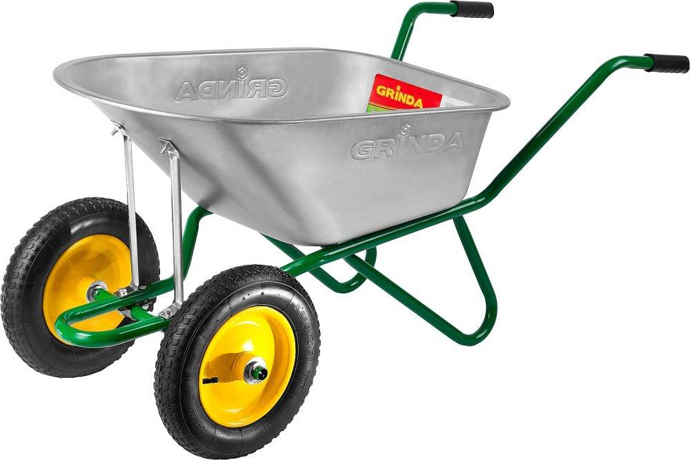 Еще одна садовая тачка от Grinda. Модель GRINDA 422400_z01 предназначена для перевозки грунта, других сыпучих и твердых материалов. Грузоподъемность, прочность кузова позволяет использовать эту тележку также на строительной площадке. Но надувные колеса подвержены повреждениям при езде по нерасчищенной местности (гвозди, осколки). Небольшой прокол потребует ремонта или замены.