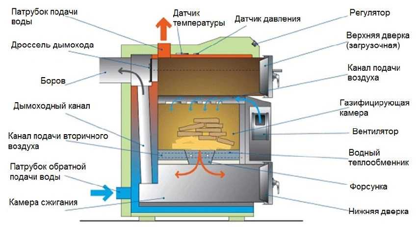Для реализации пиролизного процесса топка разделена на 2 рабочие камеры. В основной — топливо тлеет, с выделением горючих газов, которые догорают в зоне дожига при температуре 1200 С , обогащенные вторичным воздухом.