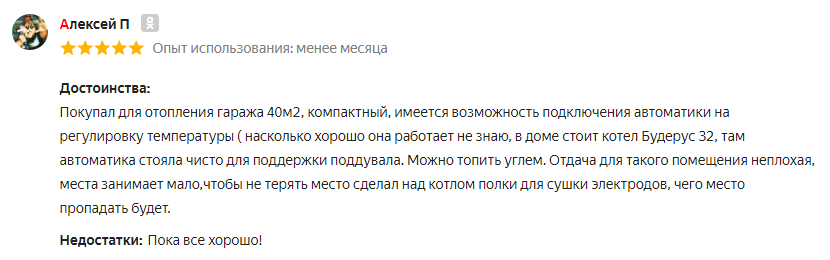 Покупателям нравится его невысокая цена, малые габариты и вес аппарата. К плюсам причисляют возможность монтажа блока ТЭН. К недостаткам относят теплообменник, изготовленный из стального материала, менее долговечного, чем чугун.