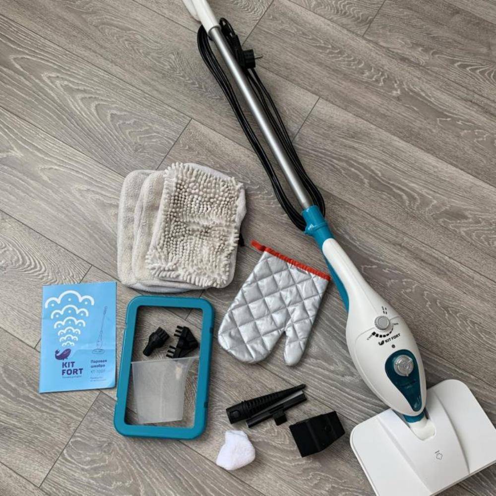 Kitfort KT-1001 3 990 (мощность 1300 Вт, 7 насадок.) Компактная легкая паровая швабра для быстрой влажной уборки небольших загрязнений. Ее неоспоримое преимущество — огромное количество аксессуаров: вертикальная ворсовая щётка, вспомогательная насадка, тряпка для отпаривания, тряпка для пола из микрофибры и т.д. В остальном это обычная паровая швабра, дающая пар под давлением до 1 бар. Основные плюсы:
