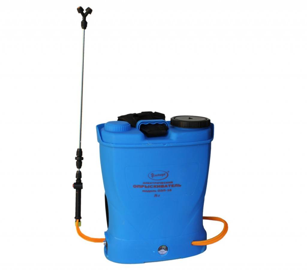 Устройство с баком для жидкости на 16 л оснащено ручным приводом, аккумулятором с емкостью 8 Ач, что обеспечивает автономную работу на протяжении 4 ч. Наличие телескопической штанги и шланга длиной 1,3 м позволяют осуществлять распыление раствора с одной точки на большое расстояние. Расход жидкости составляет 3,10 л/мин. Предусмотрен индикатор заряда батареи, фиксатор включения. В комплект входит 3 насадки, зарядное устройство. Давление в системе можно регулировать в диапазоне 1,5 – 4 бара.