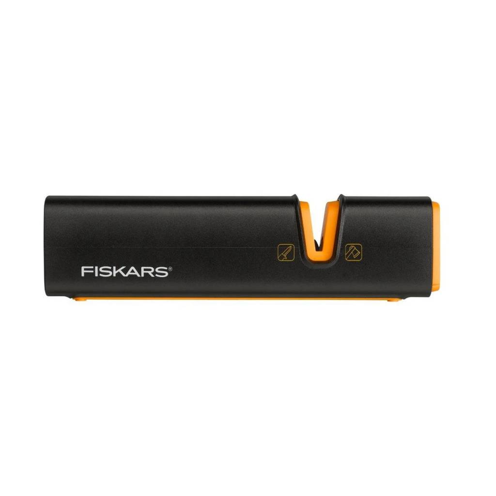 Бытовое приспособление с тремя функциями: первоначальной грубой обработки, чистовой работы (для этих целей есть 2 паза) и правки (точильный камень). Позволяет легко выдерживать нужный угол придания остроты лезвию режущей кромки.