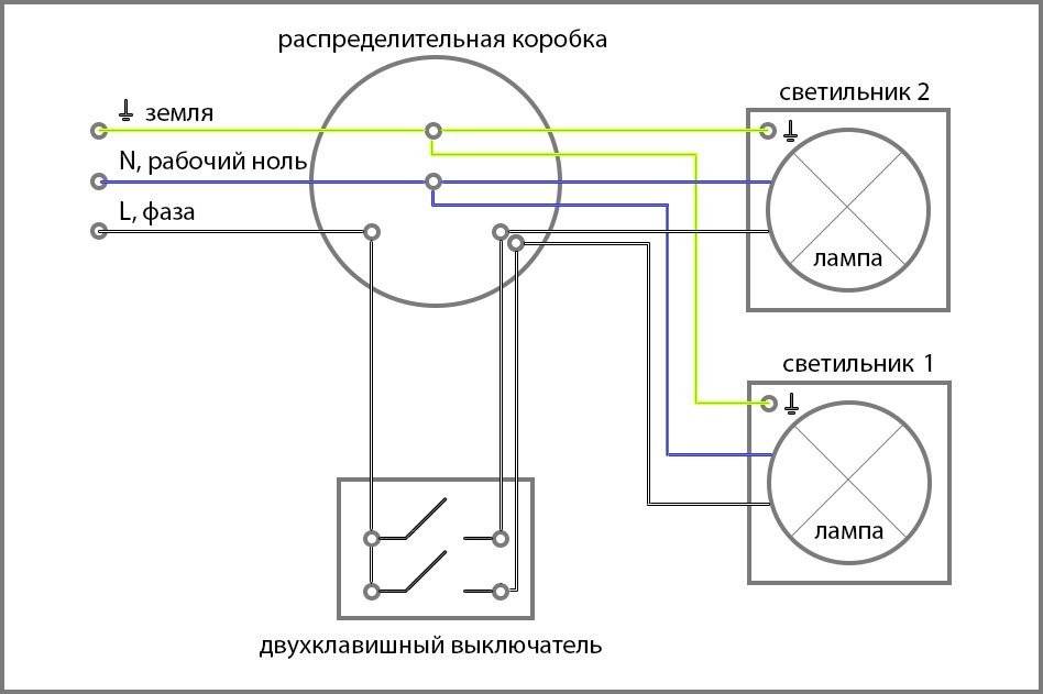 Схема подключения двухклавишного выключателя света представлена на рисунке.