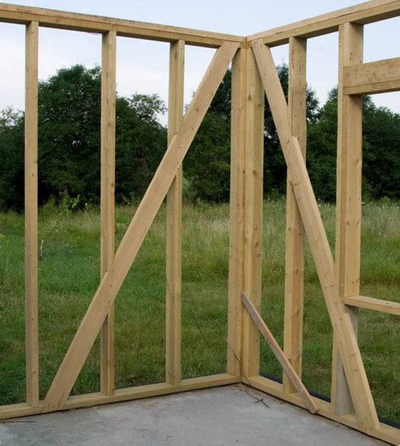 Укосины – это доски с сечением 25х100 мм. Зафиксированные на брусьях нижней, верхней обвязки и стойках, они придают конструкции пространственную жесткость.