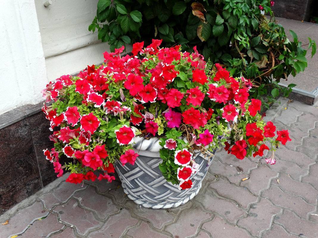 Цветы для уличных вазонов подбираются так: в центр обычно высаживают высокие растения, их окаймляют два-три вида более низких. При расположении контейнера возле стены, доминанту перемещают ближе к задней стенке.