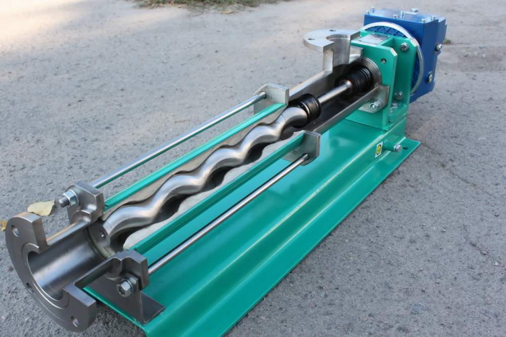 Несмотря на небольшие размеры, максимальная производительность составляет 1,8 м3//ч, а напор — 90 метров. Шланг опускают в скважину на заданную глубину, соединяют гибкий вал с валом редуктора электродвигателя. Достоинство насоса состоит в том, что электродвигатель находится наверху. В случае засорения насоса отсоединяют гибкий вал, вытаскивают шланг, промывают.