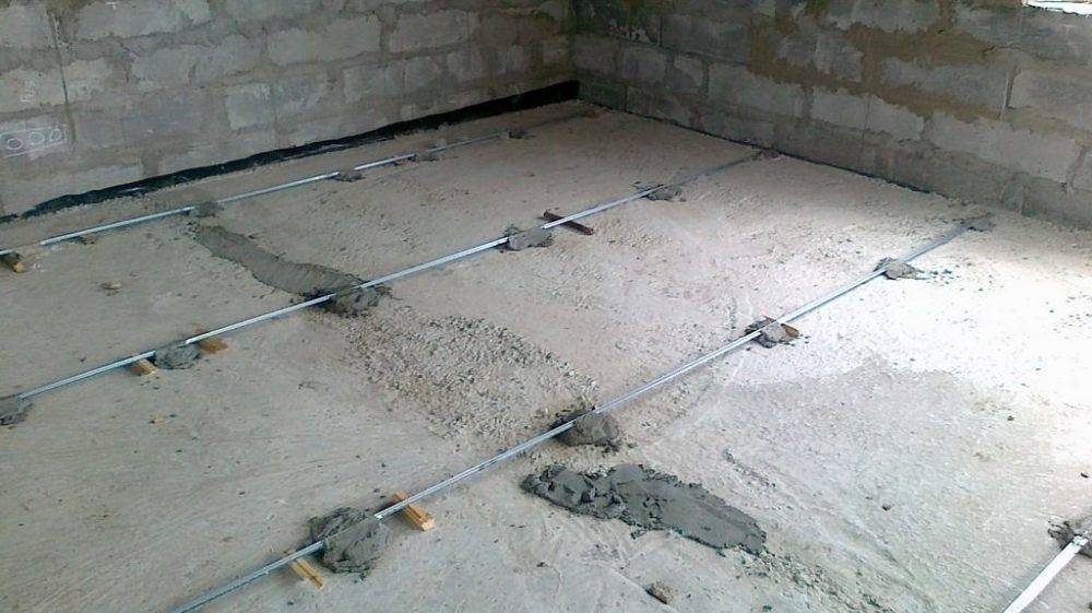 При заливках стяжек в технических помещениях нередко в качестве маяков-направляющих используют даже ненужные трубы круглого или прямоугольного сечения. В ряде случаев они даже привариваются к армирующей конструкции будущей стяжки на требуемом нулевом уровне по своему верхнему краю.