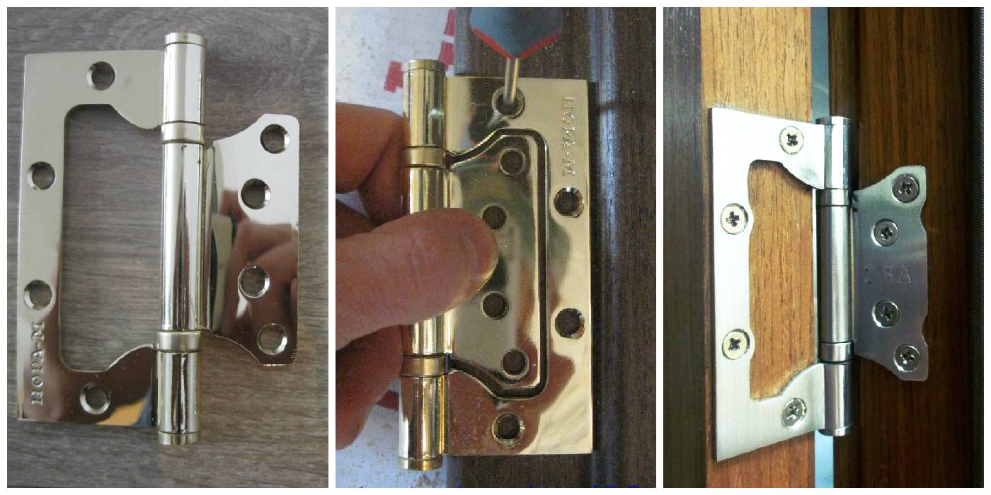 Устанавливаем петли на место. Они устанавливаются на расстоянии 20-25см от края полотна двери. Петли удобно использовать накладные в виде бабочки. Такие петли не требуют специальных монтажных вырезов.