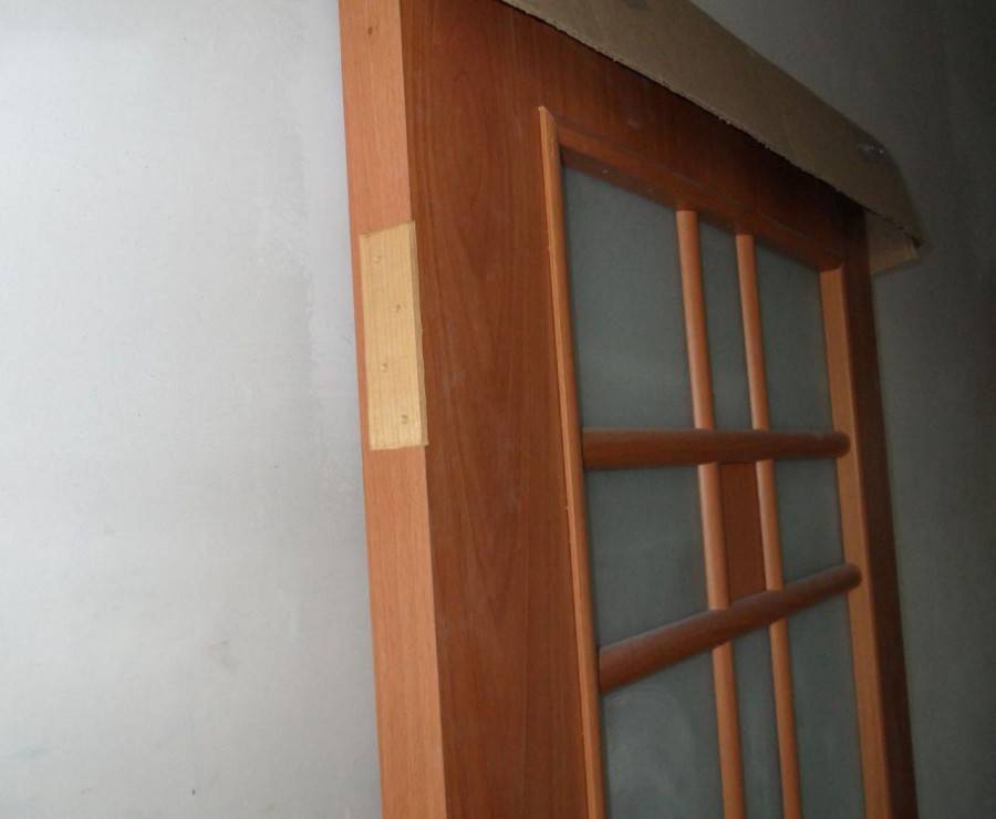 А именно, нашить поперек дверной коробки ровные рейки в количестве двух штук (вверху и внизу), которые позволят установить блок четко в плоскости со стеной. Чтобы не повредить саму коробку, для фиксации этих перемычек в торец дверной коробки можно привинтить деревянные накладки, к которым прикрепить перемычки.