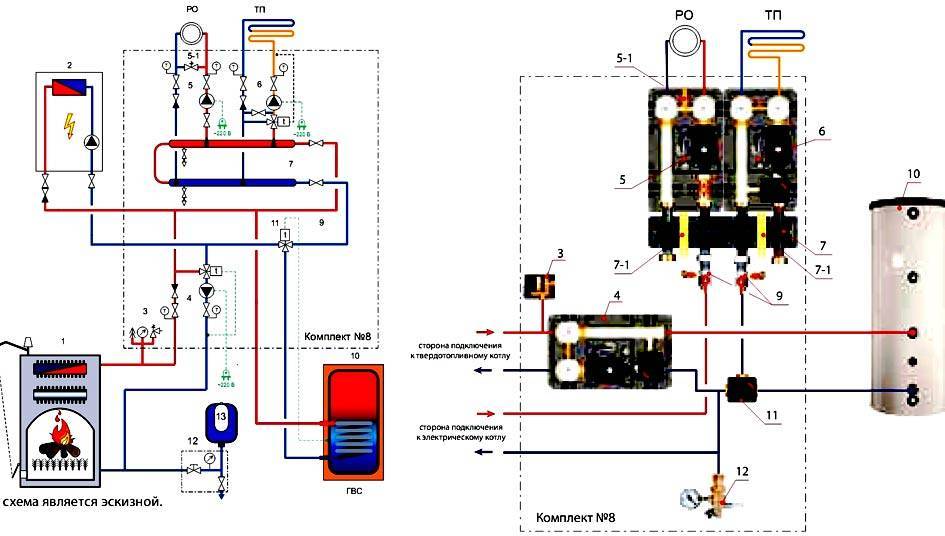 В том случае, когда отопительный агрегат — единственный в доме источник тепла, то для его присоединения рекомендуется использовать следующую базовую схему: Примечание. Модулируемое управление Многоступенчатый контроллер для системы простого каскада с помощью пропорционально-интегрально-дифференциального регулирования ПИД постоянно измеряет температуру подающегося в систему теплоносителя, сравнивает ее с расчетным значением и определяет, какую горелку следует включить, а какую выключить. Они имеют два контура и способны не только обогревать помещение, но и снабжать жильцов горячей водой, не подключая при этом дополнительных газовых водонагревательных горелок. Чтобы котёл мог одновременно нагревать воду в контуре отопления, системе ГВС и в буферной емкости, его мощность должна вдвое превышать расчетную. Отопительный контур. Отопление: ТТ котел «Тополь-М» + электрический котел «Proterm».