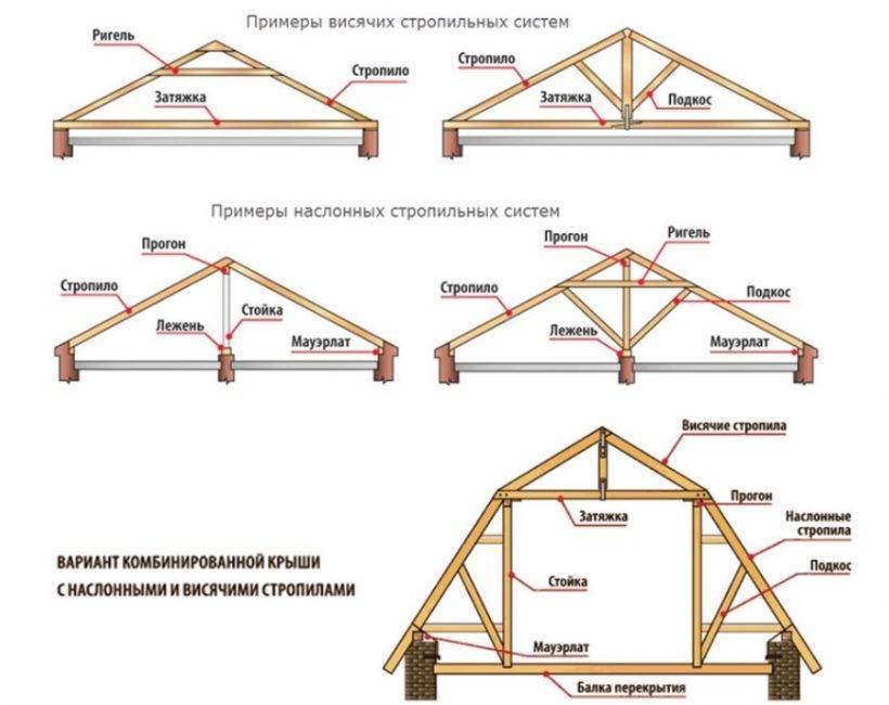 Каркас для устройства состоит из элементов треугольной формы, благодаря чему, даже испытывая большое количество переменных нагрузок, конструкция не теряет жесткости. Стропильные системы скатных крыш подразделяют на висячие и наслонные.