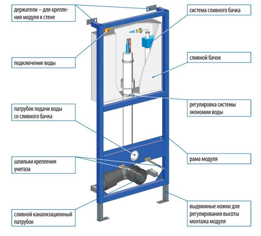 1. Стальная рама (укрепленный элемент, так как он — основа для крепления наиболее крупного и тяжелого элемента унитаза, его чаши). Процесс установки подвесного унитаза настоятельно рекомендуется начинать именно с этой составляющей. Раму необходимо зафиксировать на стене, а также прикрепить к полу, таким образом, в будущем унитаз сможет полностью выдержать нагрузку в виде веса взрослого человека. По этой причине раму ни в коем случае нельзя крепить на непрочные стенки, примером которых являются гипсокартонные перегородки (есть вероятность, что крепление будет ненадежным и унитаз просто упадет).