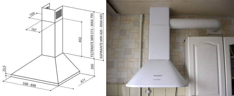 Самая широкая нижняя часть задаёт основные габариты шкафа. Наружный размер шкафа должен в точности соответствовать ширине вытяжки. Глубина мебельного корпуса может быть больше на 50–60 мм, в этом случае вытяжка сдвигается к переднему краю, а открытый участок сзади закрывается тонкой скрепляющей перегородкой