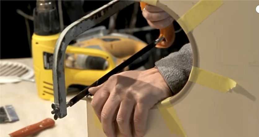 - далее при помощи специального электролобзика выпиливаются отверстия под воздуховод;