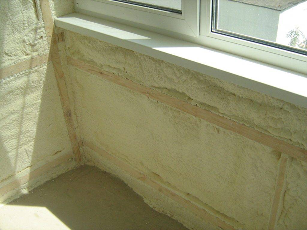Перед укладкой утепляющего слоя обязательно нужно запенить монтажной пеной все щели на балконном потолке (лишнее срезать), обработать поверхность противогрибковым средством и очистить от пыли.