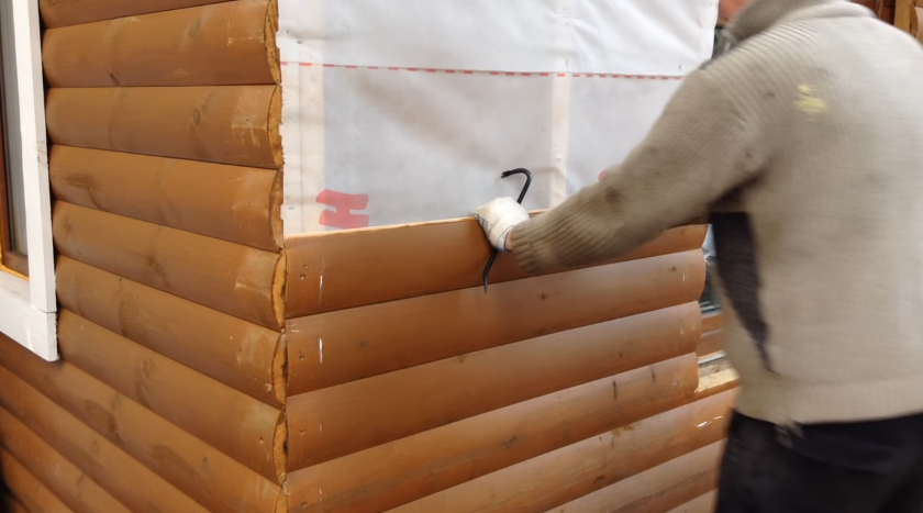 Желательно выполнить финишную обработку противопожарным составом. Предварительно нужно проверить качество конопатки стеновой поверхности, и при необходимости законопатить оголённые участки.