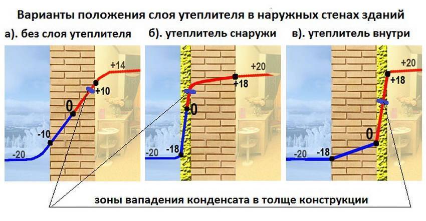 Строительные нормы требуют, чтобы утепление стен в отапливаемом доме было выполнено снаружи. Это правило обосновано физическими процессами, происходящими при колебаниях температурного режима.