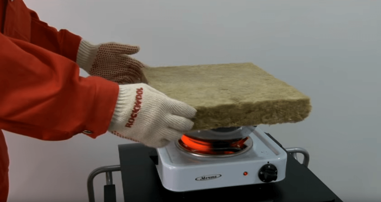 Мы видим, что вата не только не воспламеняется, она вообще никак не реагирует на воздействие огня. Более того, с другой стороны плиты можно прикоснуться ладонью, и температура поверхности не будет превышать 20 градусов. Это еще раз демонстрирует высокие теплоизоляционные качества материала.
