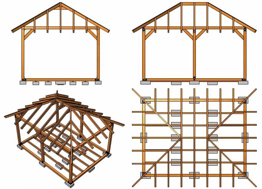 Если же беседка устанавливается на деревянные столбы, то следует предварительно проверить прочность закрепления её опор, они должны стоять строго вертикально, а для жёсткости и устойчивости каркаса снизу их перевязывают перемычками. Сверху тоже монтируются перемычки, которые будут являться обвязкой под скатную конструкцию. Из-за высокой нагрузки опоры могут постепенно разойтись, поэтому рекомендуется заранее скрепить их на верхних концах с помощью диагональных перемычек, а в местах стыковки проложить деревянные или стальные накладки.