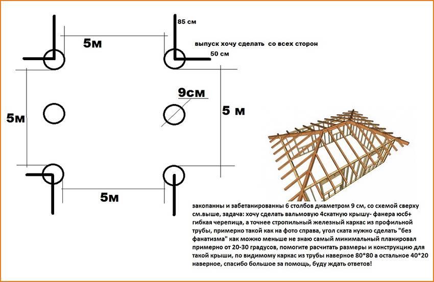 Небольшие вальмовые крыши можно собирать на опорах из столбов, которые предварительно следует хорошо закрепить