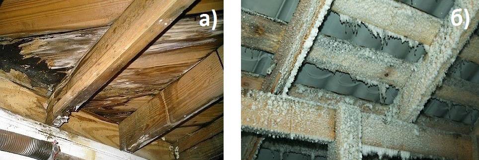 На фото: а) – разрушение стропильной системы от увлажнения конденсатом, б) – замерзший конденсат на стропилах зимой.
