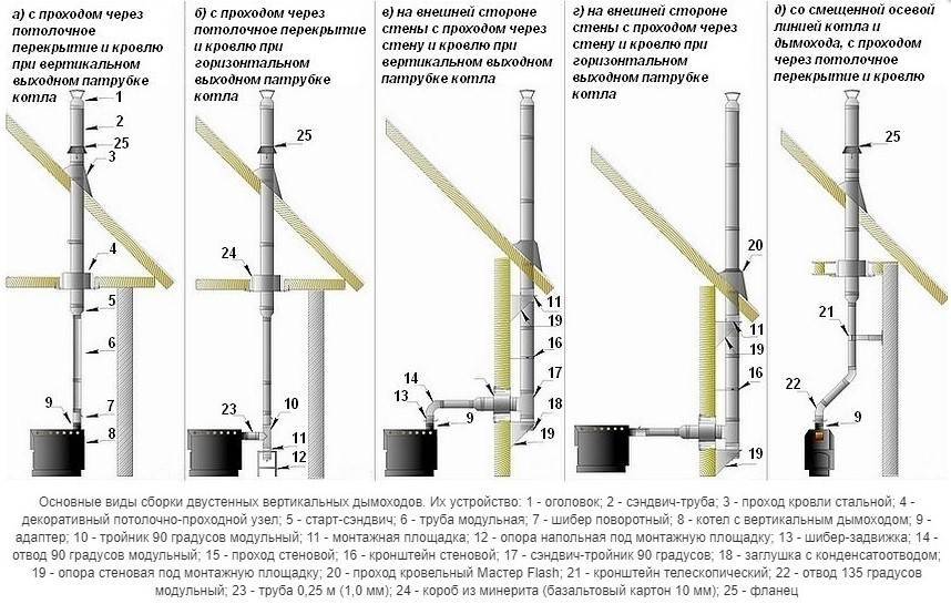 Обратите внимание, что проход дымовой трубы через кровлю или стену должен быть сделан через специальный проходной негорючий узел