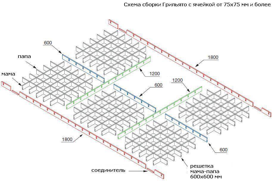 Подробная схема монтажа Грильято с ячейкой от 75х75 мм и более