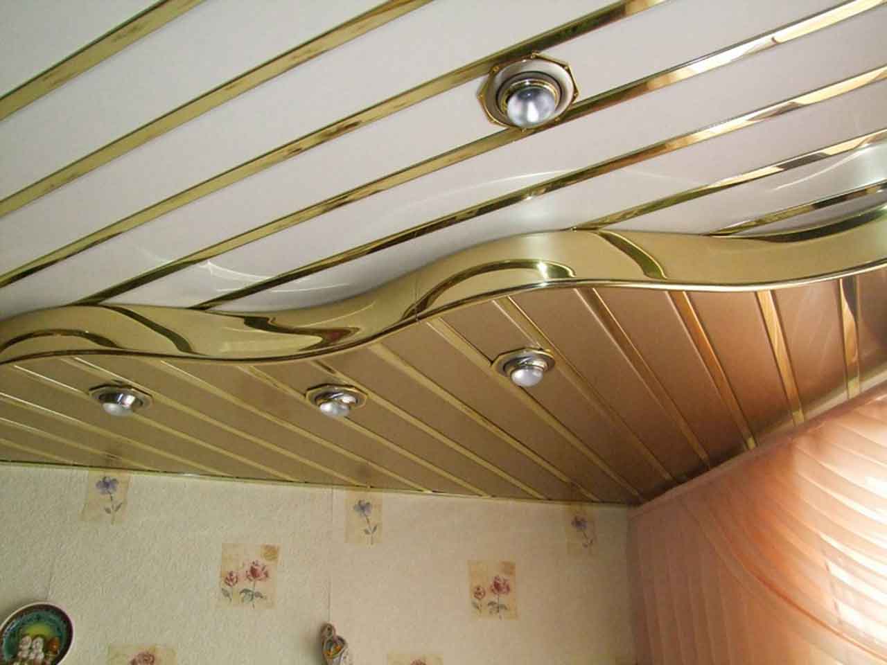 Потолки из ПВХ-реек (в народе называемых вагонкой или панелями) нередко используют для жилых помещений – благодаря влагостойкости такие конструкции отлично подходят для санузлов, бани, сауны. Стандартная длина рейки – 3 метра.