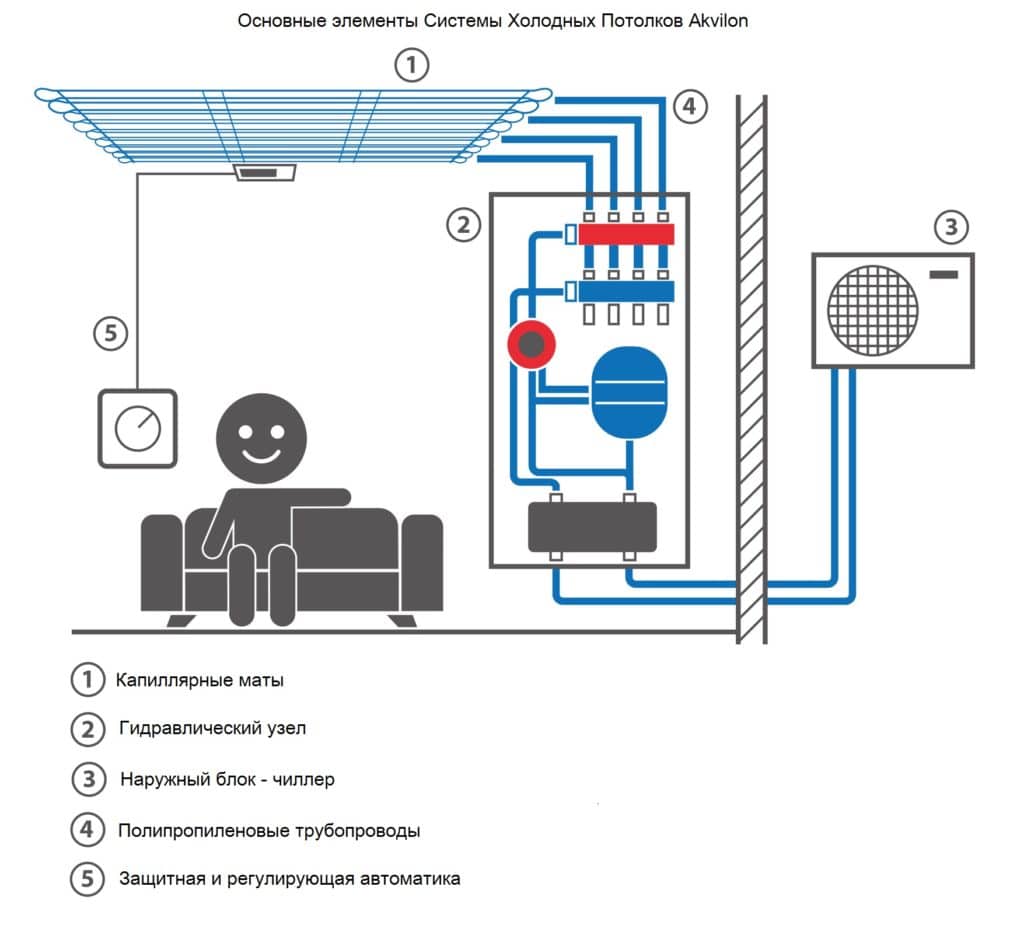 В качестве рабочей среды холодного потолка выступает дистиллированная вода, ее подготавливает специализированная холодильная машина