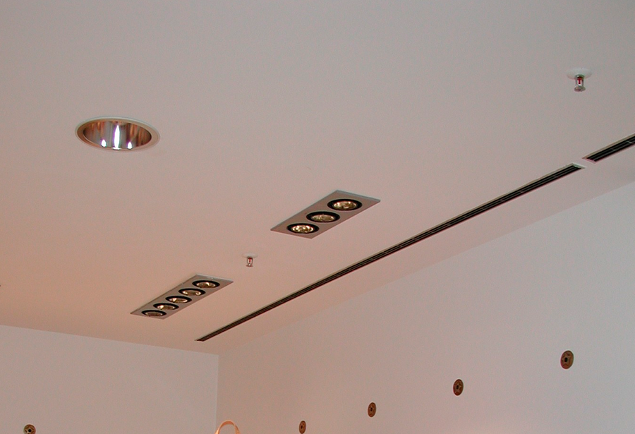 - перед установкой ПВХ полотна необходимо закрепить воздуховоды, протянуть проводку, зафиксировать короб для вытяжки под натяжной потолок, проверить герметичность всех стыков;