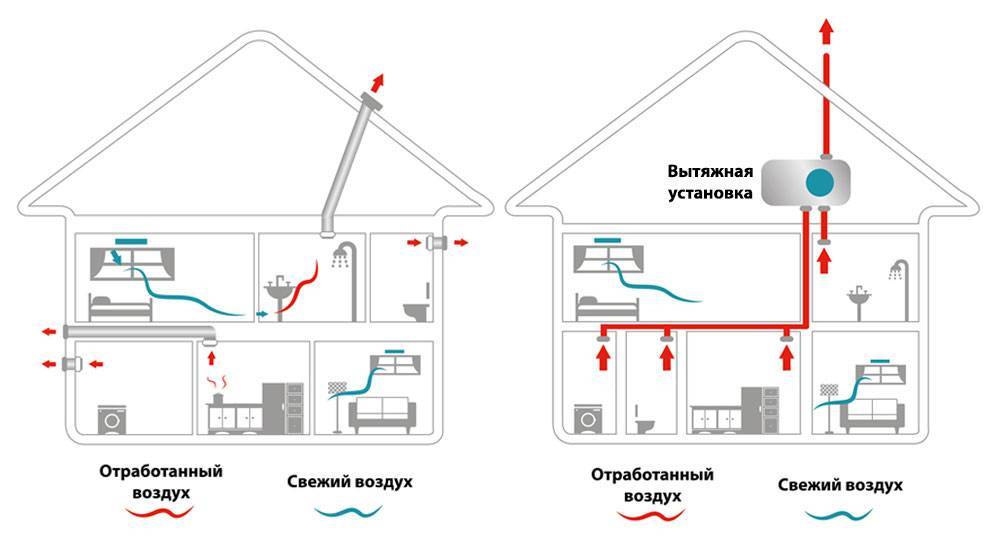 Принцип работы принудительной системы такой: работает вентилятор на потолке – движение воздуха есть, не работает – оно прекращается. Этим и отличается принудительное вентилирование от естественного.