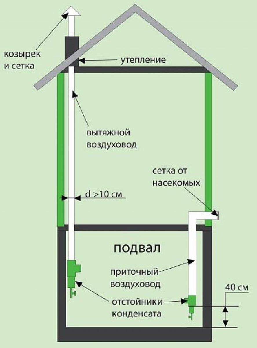 Чтобы подвал был вентилируемым, сухим, хватит даже одной трубы. Положительную роль сыграют любые щели.